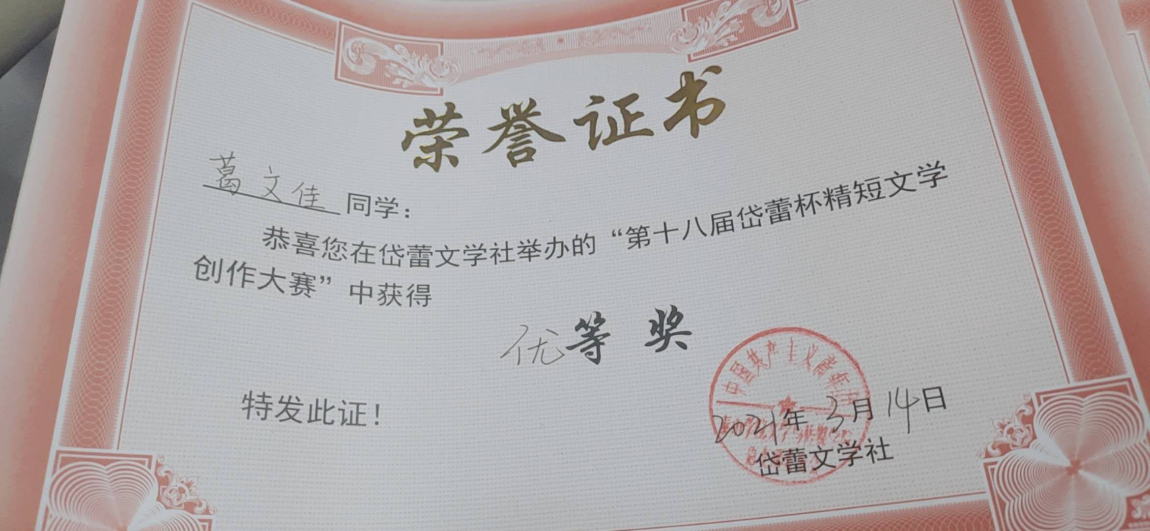 热烈祝贺药学院葛文佳荣获第十八届岱蕾杯精短文学创作大赛优等奖