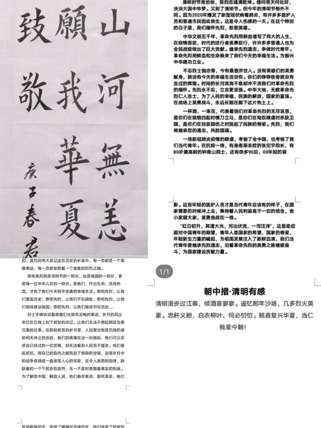 活动宣传结束后,学生踊跃报名参加,准备的形式也是多种多样,异彩纷呈。有的学生专注于缅怀抗疫过程中牺牲在一线的志愿者,抒发自己难以言表的感激与敬仰之情;有的学生将镜头指向一位位从病魔手中抢回患者而英勇牺牲的白衣天使,讴歌每一位白衣天使的英勇无畏;有的学生则借清明时节,抚今追昔,感谢那些为国家兴亡、民族自强献出生命的革命英烈。此次活动中,学生们纷纷表示,在熟知革命历史的基础上,他们将从思想深处认识清明祭英烈的深刻意义,也纷纷表示会更加珍惜今天的幸福生活。在经过评委层层筛选之后,徐东获得一等奖,刘书君、郎依斐、王文慧获得二等奖,周君凤、赵敏、姜倩、王华伟、田歌、罗丹获得三等奖。