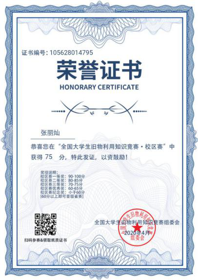 我院张丽灿获“全国大学生旧物利用知识竞赛”三等奖