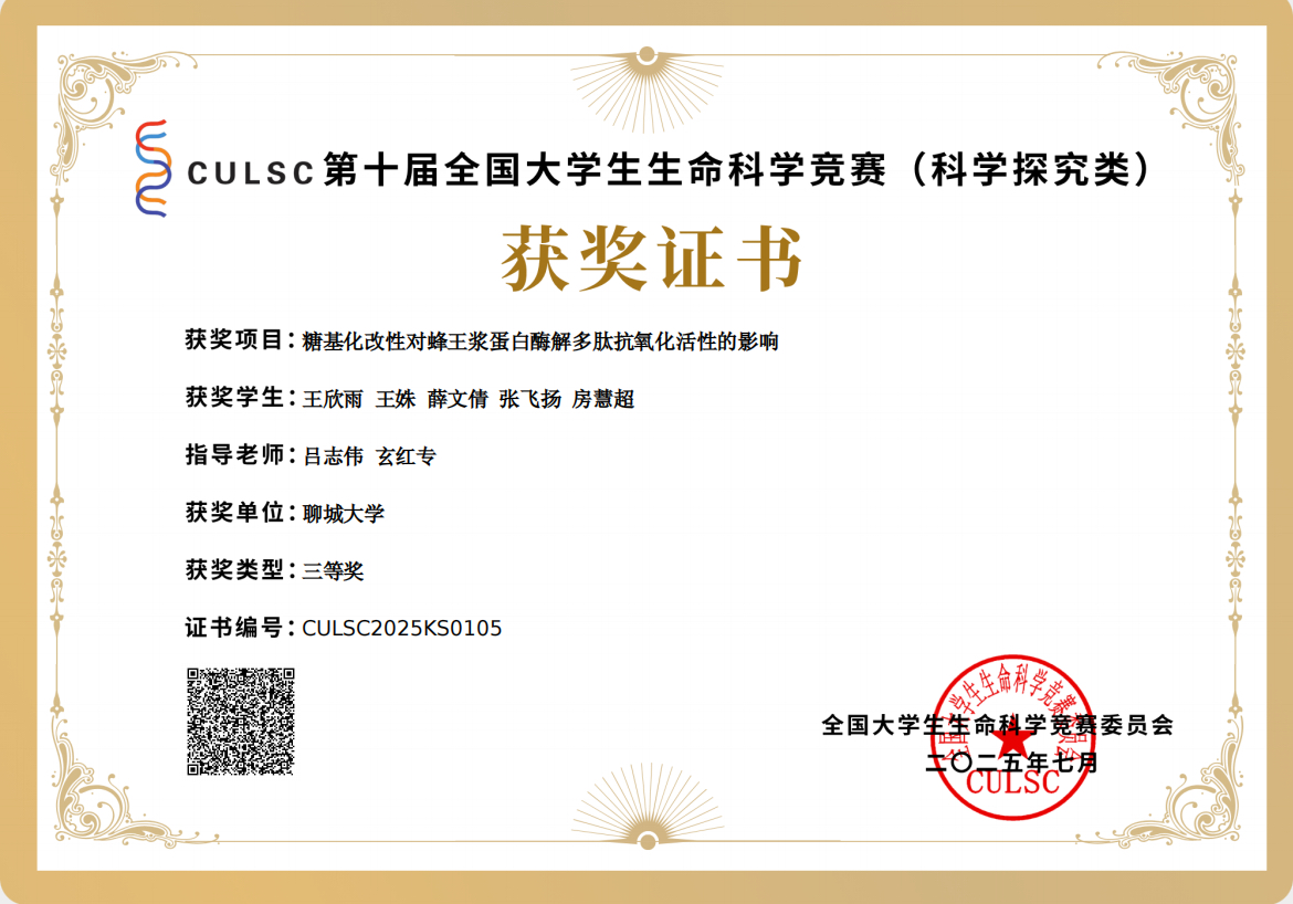 热烈祝贺ok138太阳集团薛文倩荣获CULSC第十届全国大学生生命科学竞赛(科学探究类)三等奖