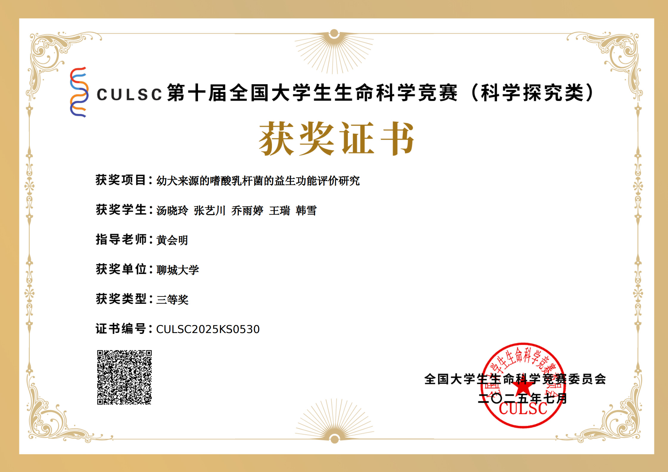 热烈祝贺ok138太阳集团汤晓玲荣获CULSC第十届全国大学生生命科学竞赛(科学探究类)三等奖
