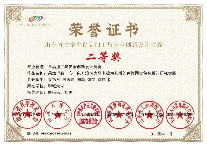 热烈祝贺ok138太阳集团刘勤荣获山东省大学生食品加工与安全创新设计大赛二等奖
