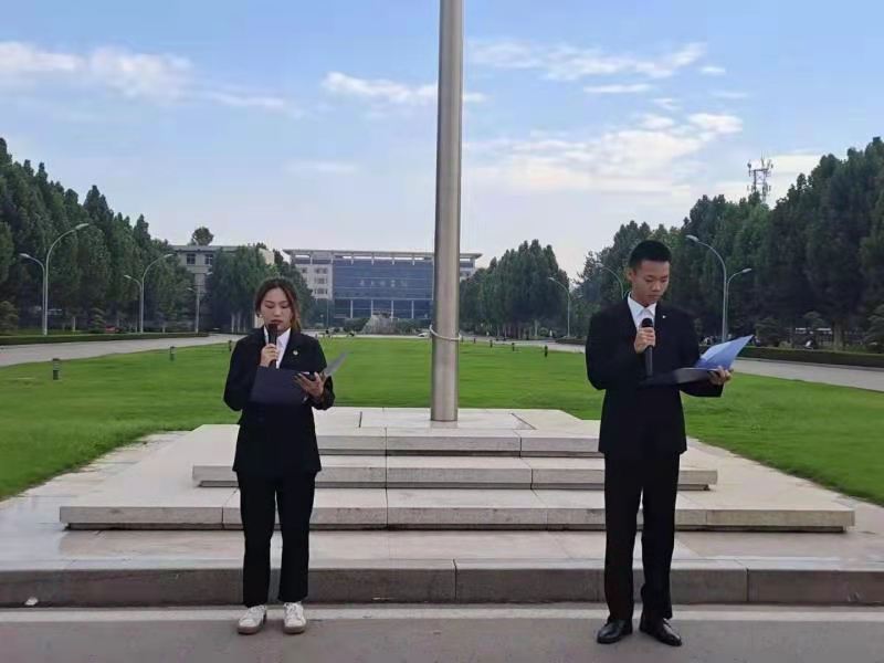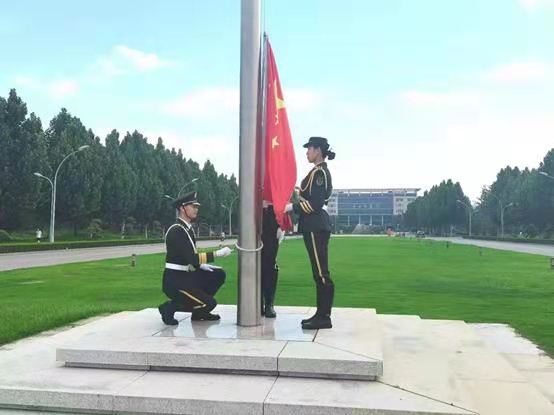迎着朝阳,国旗护卫队队员护卫着鲜艳的五星红旗入场,他们着装整齐、步伐矫健,伴随着《义勇军进行曲》的响起,五星红旗冉冉升起,在场全体师生庄严地向国旗行注目礼。