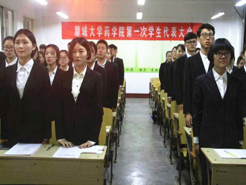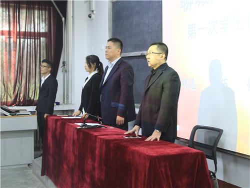 在庄严肃穆的国歌声中,大会正式拉开序幕。党总支书记刘德芳发表重要讲话。当前,学院正处于发展建设的关键时期。第一次学生代表大会的召开,是学院发挥学生民主自治作用的又一重要举措。刘德芳指出,自学院成立以来,学院学生会在院党总支的领导和分团委的指导下,深入学习习近平总书记讲话精神,努力打牢青年学生的共同思想基础;围绕学校改革发展大局,努力发挥青年学生的主人翁作用;践行“敬业博学 求实创新”的聊大校训,牢记“明德 弘药 惟真 求新”的学院院训,努力营造优良院风学风;着眼高品位大学文化建设,努力开展丰富多彩的校园文化活动;关注同学们普遍性利益诉求,努力为广大同学服务;注重能力培养和自身建设,努力完善学生会自我管理体系。