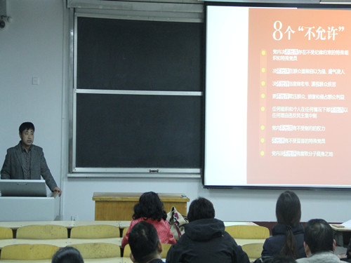 11月17日,药学院与生命科学学院于2#116联合举办党的十八届六中全会解读活动。政治与公共管理学院系主任秦正为为两院师生党员解读党的十八届六中全会精神。