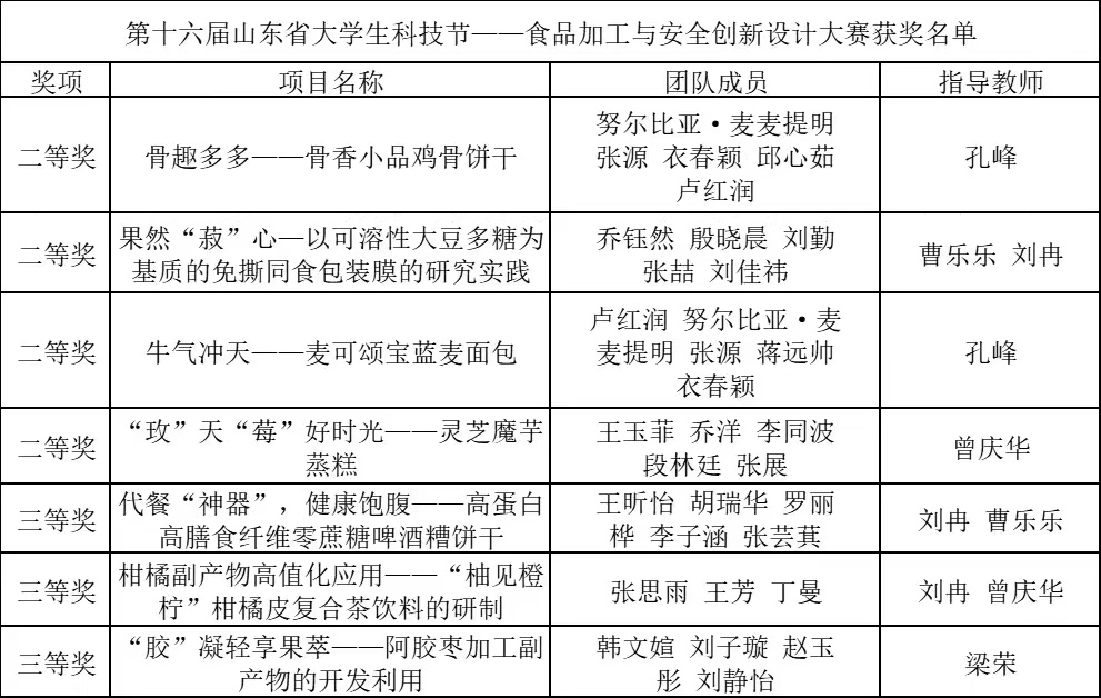 ok138太阳集团在第十六届山东省大学生科技节——食品加工与安全创新设计大赛中获得佳绩