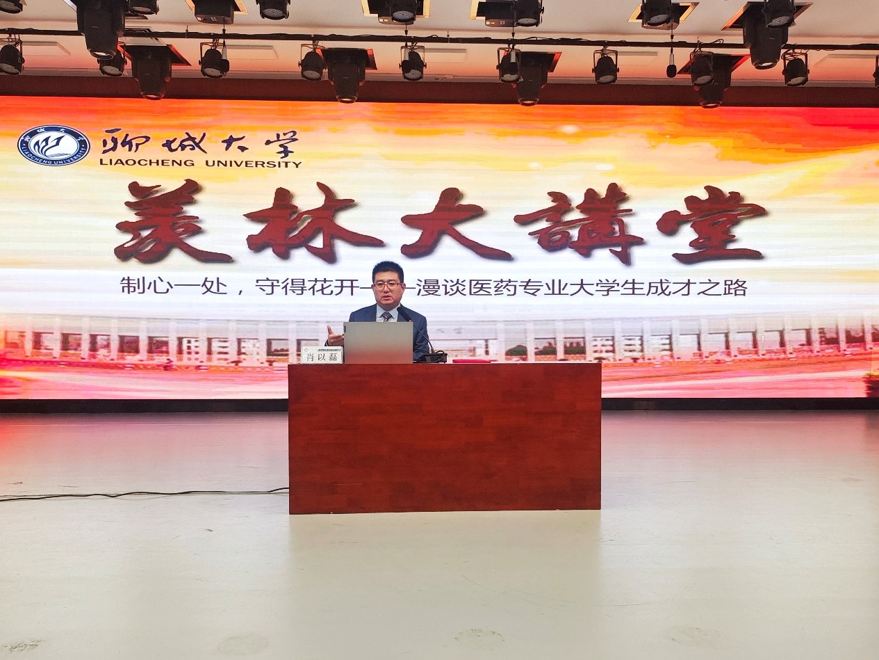 5月18日,由药学院承办的OK138太阳集团第94期“羡林大讲堂”于东校区辰晖楼三楼顺利举办。泰山学者青年专家、聊城市有突出贡献中青年专家、聊城市青年科技获奖者肖以磊应邀做客本期羡林大讲堂,作了题为《制心一处,守得花开——漫谈医药专业大学生成才之路》的报告。校党委常委、副校长赵长林,药学院党委书记程波、院长冀芦沙、党委副书记李永新、辅导员、班主任及2021级部分学生参加了报告会。