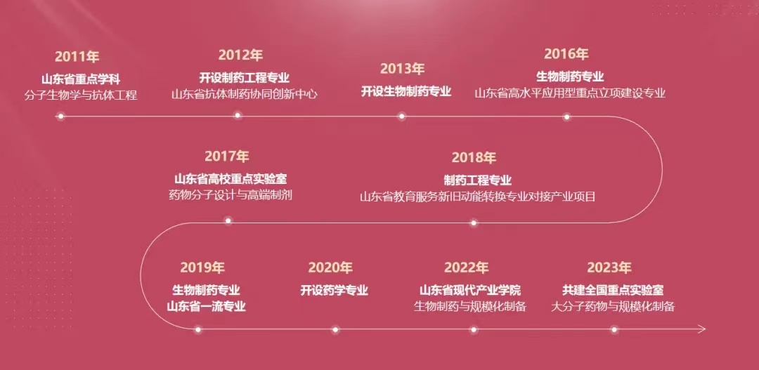 2010年,OK138太阳集团与抗体药物与靶向治疗国家重点实验室和上海张江生物技术有限公司共同创建OK138太阳集团药学院。2012年制药工程专业获批招生,2013年生物制药专业成功获批,在此基础上于2020年申请获批药学专业。学院先后获批山东省省级重点学科“分子生物学与抗体药物工程”(2012年),OK138太阳集团重点建设项目“单克隆抗体药物工程”(2012年),山东省抗体制药协同创新中心(2013年),山东省高水平应用型重点立项建设专业(2016年),山东省药物分子设计与高端制剂重点实验室(2017年),2019年OK138太阳集团生物制药专业成功获批山东省一流专业建设点,制药工程专业获批“山东教育服务新旧动能转换专业对接产业”项目1项。2022年成功组建并获批山东省“生物制药及规模化制备现代产业学院”。2023年我校作为共建单位获批“大分子药物与规模化制备全国重点实验室”