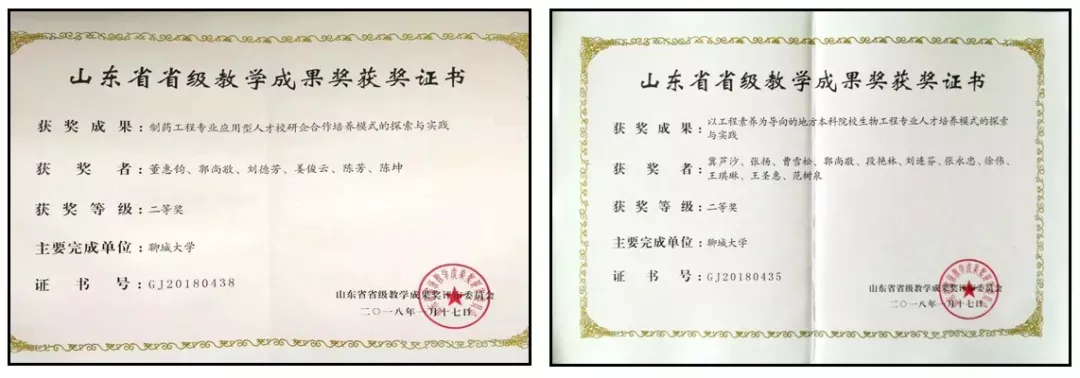 2018年,学院“以工程素养为导向的地方本科院校生物工程专业人才培养模式的探索与实践”与“制药工程专业应用型人才校研企合作培养模式的探索与实践”分别获山东省本科教学成果二等奖。2021年学院教师参与完成的“山东省普通本科高校创新创业教育内容标准的研制与实践”获山东省本科教学成果特等奖。