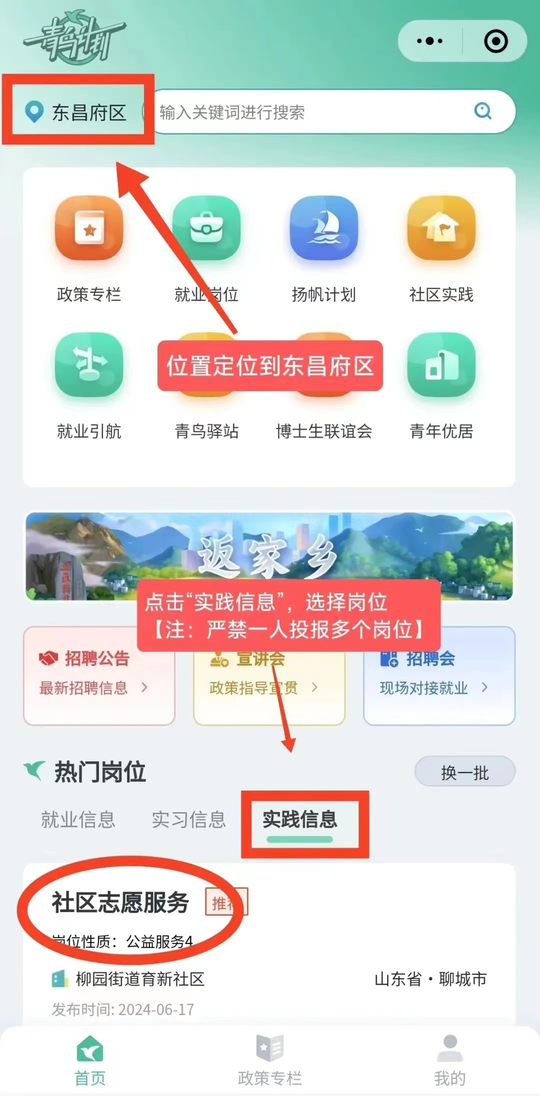 4.定位“聊城市-东昌府区”选择“实践信息”