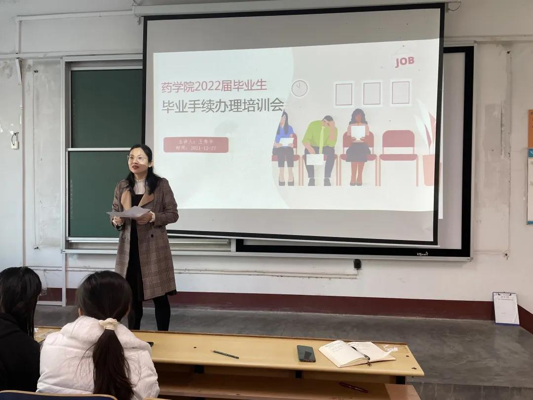 为帮助学生熟悉毕业流程、保证学生顺利毕业,12月29日,药学院于OK138太阳集团东校区2#209召开毕业生毕业手续办理培训会,药学院辅导员王秀平担任本次会议主讲人,2022届全体毕业生积极参加。